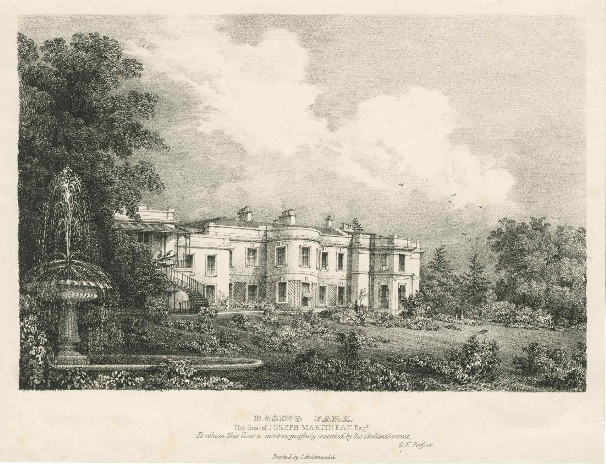 | Basing Park: engraving of the house in 1833, after the addition of the wing on the right by Sydney Smirke. |